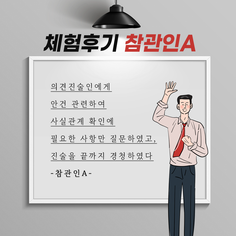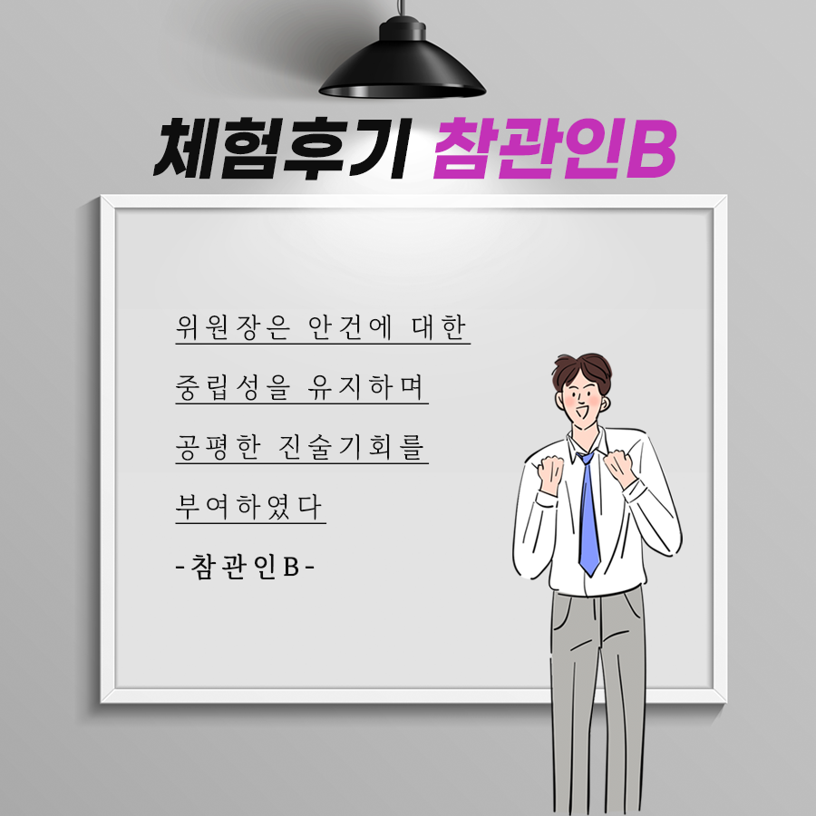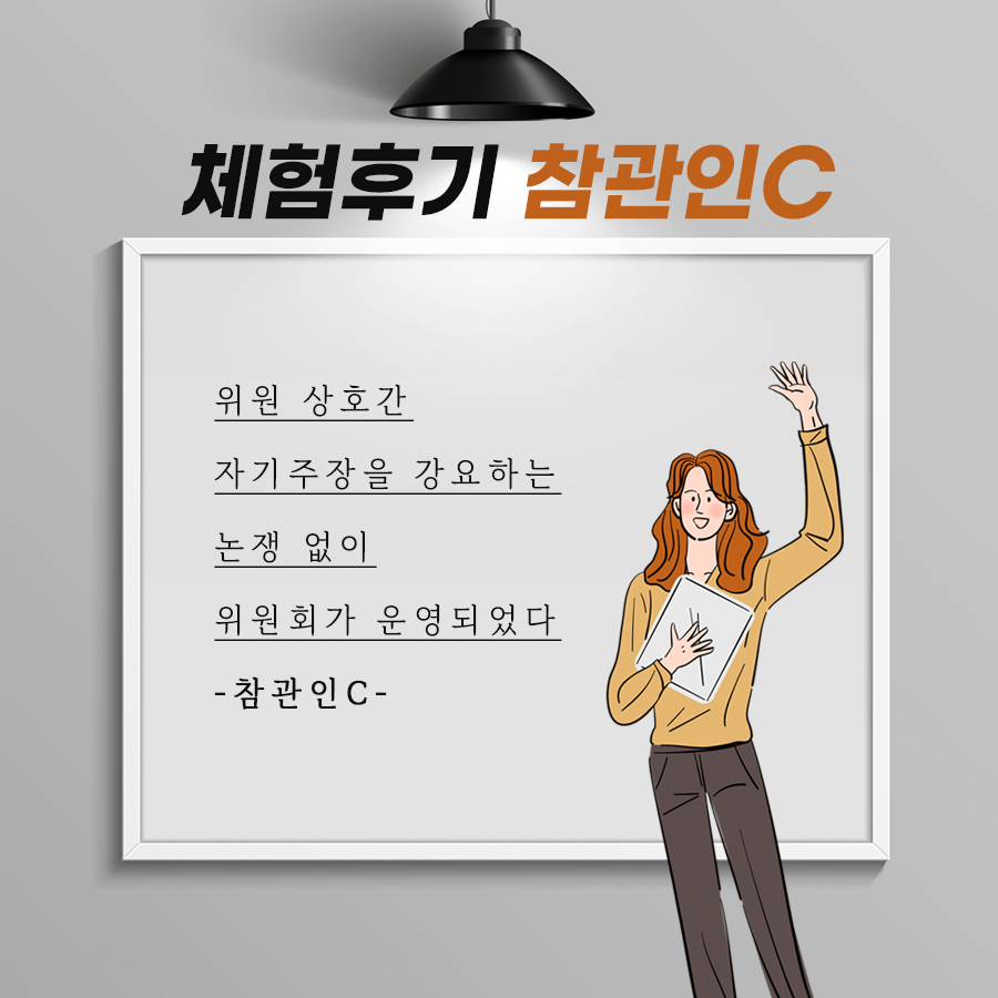 국세청 납세자보호위원회에 참여한 참관인 체험후기 참관인A는 의견진술인에게 안건 관련하여 사실관계 확인에 필요한 사항만 질문하였고, 진술을 끝까지 경청하였다. 참관인B는 위원장은 안건에 대한 중립성을 유지하며 공평한 진술기회를 부여하였다. 참관인C는 위원 상호간 자기주장을 강요하는 논쟁 없이 위원회가 운영되었다.