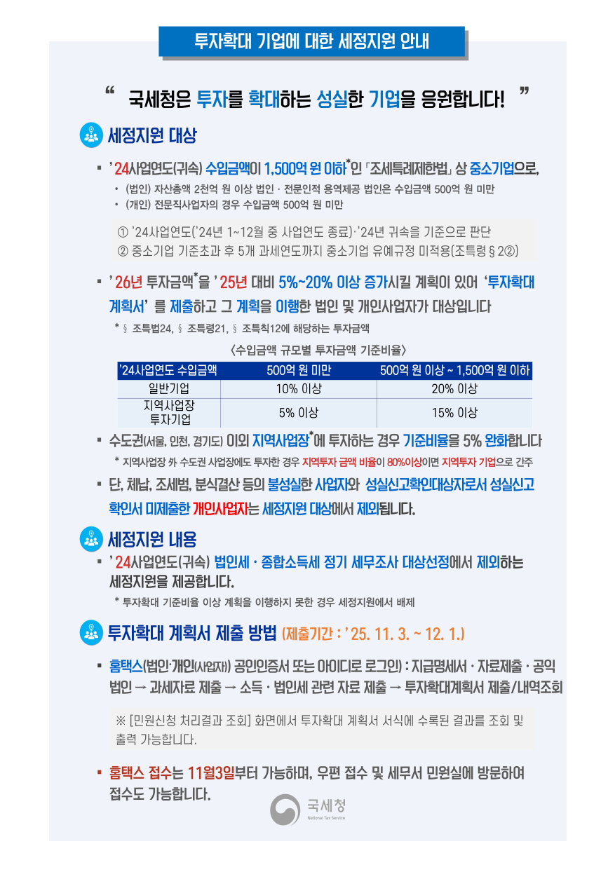 투자확대 기업에 대한 세정지원 안내