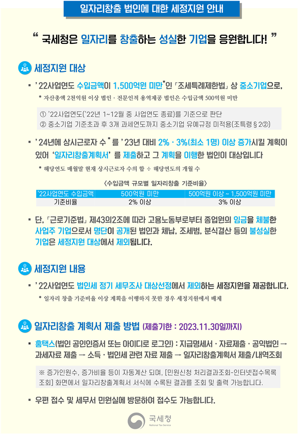 일자리창출 우수기업에 대한 세정지원 안내
