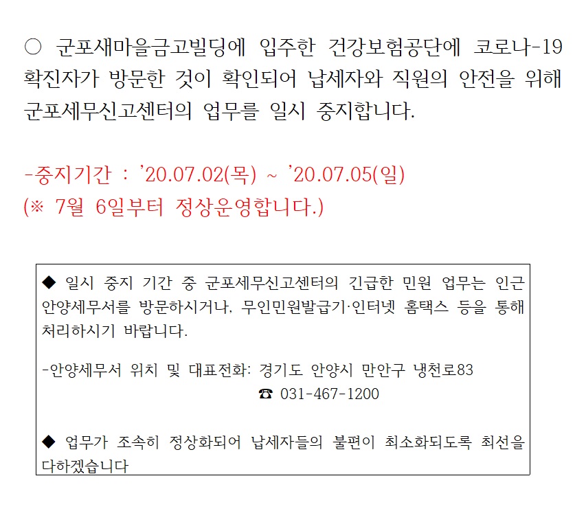 <긴급> 군포세무신고센터 업무 일시중지 안내