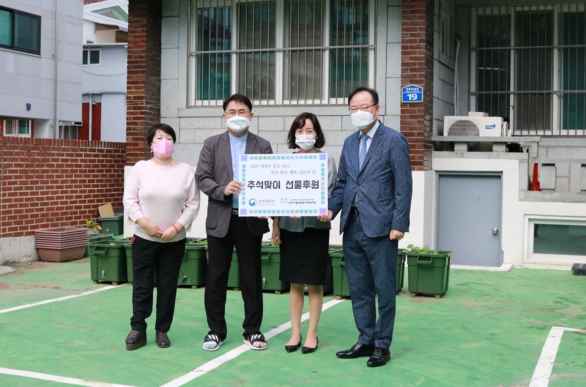안양세무서(서장 최지은)는 지난 9월 25일(금) 2020년 추석을 맞이하여 사회복지시설을 찾아 위로와 지원을 하여 이웃사랑을 실천하였습니다. 명절을 맞이하여 따뜻한 나눔 문화를 확산하고자 사회복지 시설을 방문하였으며, 코로나19등으로 힘든시기를 겪는 복지시설의 운영현황과 애로사항을 경청하고 격려하는 뜻깊은 시간을 가졌습니다.