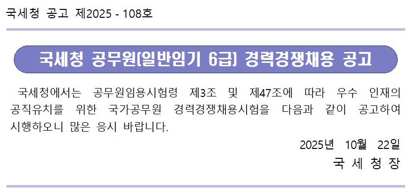국세청 공무원(일반임기 6급) 경력경쟁채용 공고