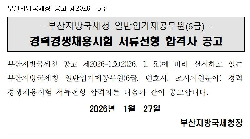 부산지방국세청 일반임기제공무원(6급) 경력경쟁채용시험 서류전형 합격자 공고