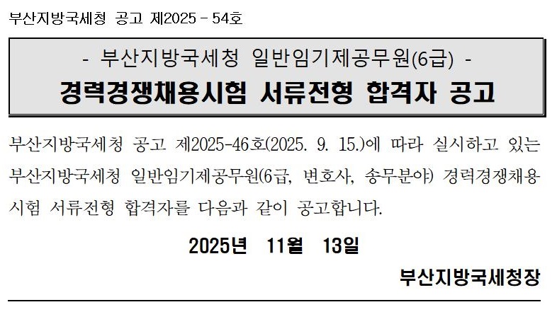 부산지방국세청 일반임기제공무원(6급, 변호사, 송무분야) 서류전형 합격자 공고
