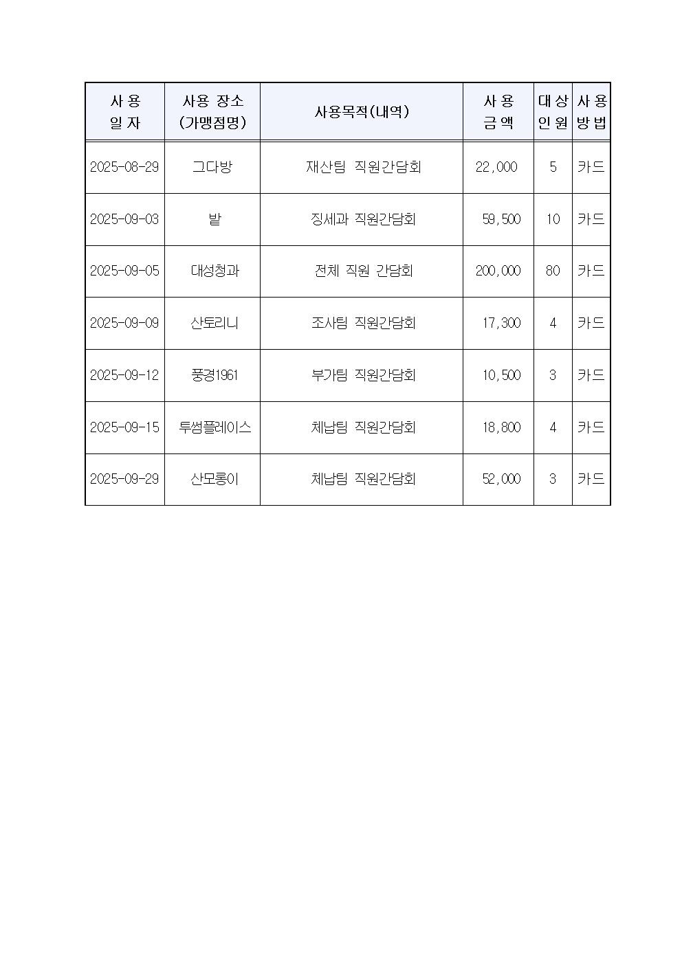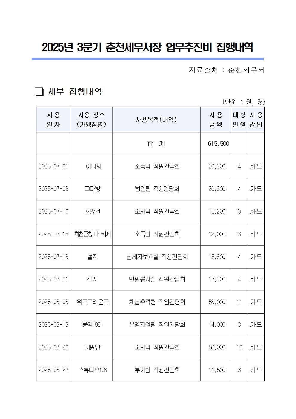 2025년 3분기 춘천세무서장 업무추진비 집행내역