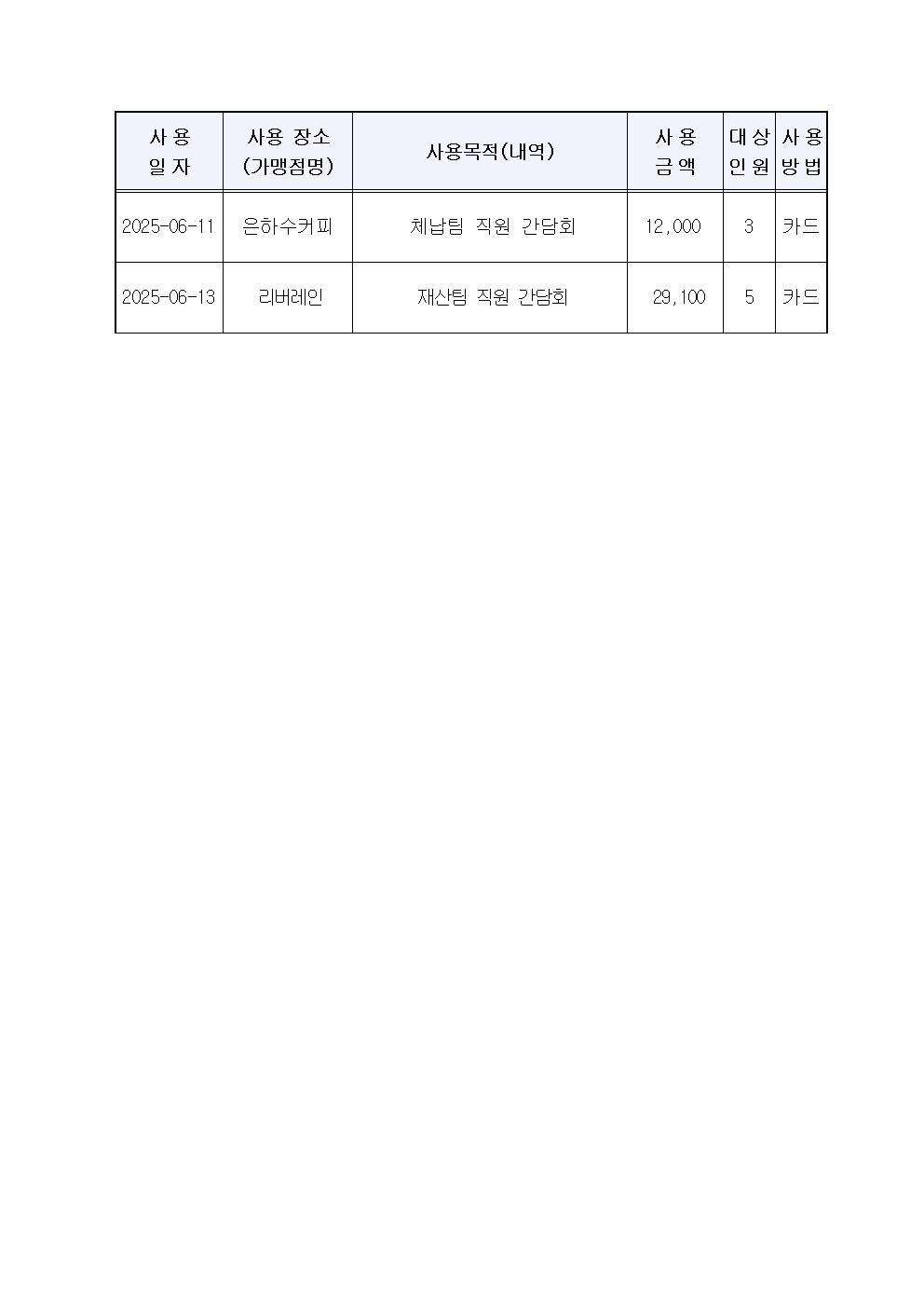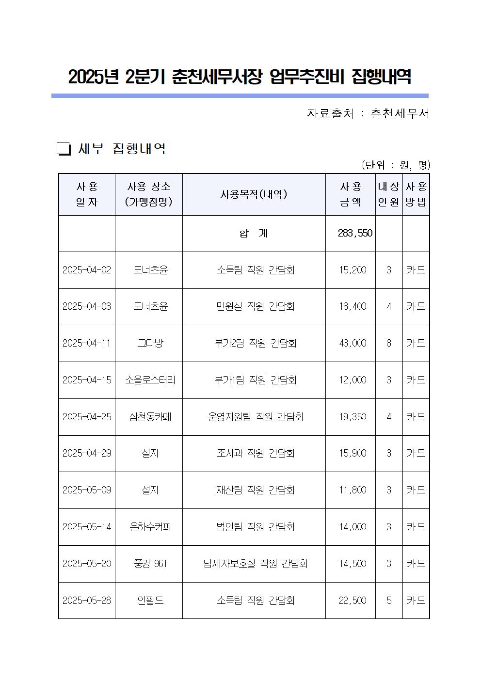 2025년 2분기 춘천세무서장 업무추진비 집행내역