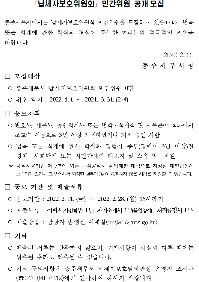 충주세무서에서는 납세자보호위원회 민간위원을 모집하고 있습니다. 법률 또는 회계에 관한 학식과 경험이 풍부한 여러분의 적극적인 지원을 바랍니다.