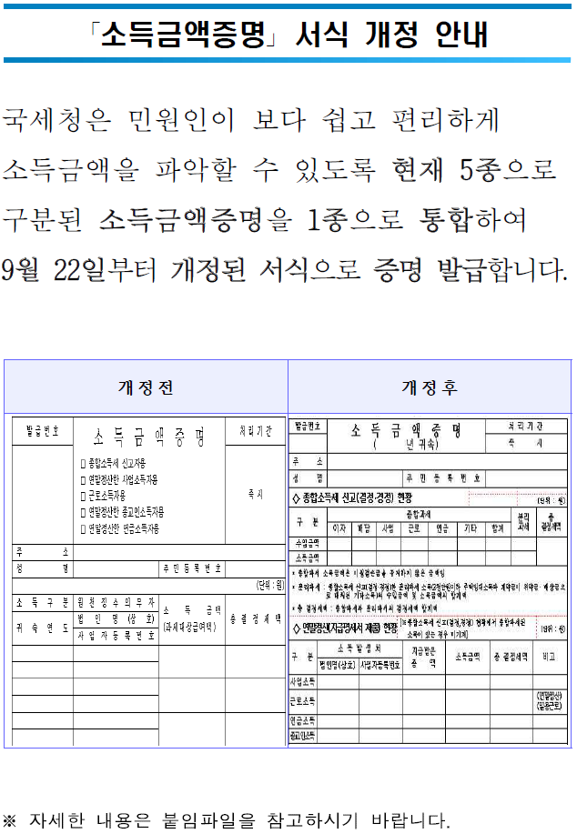 국세청은 민원인이 보다 쉽고 편리하게 소득금액을 파악할 수 있도록 현재 5종으로 구분된 소득금액증명을 1종으로 통합하여 9월 22일부터 개정된 서식으로 증명 발급합니다.