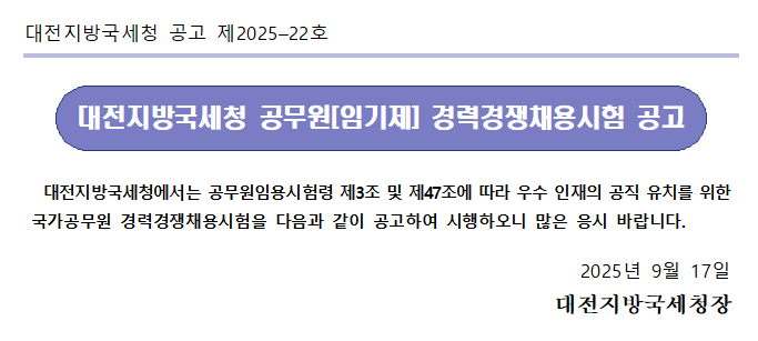 대전지방국세청 일반임기제공무원(6급) 경력경쟁채용 공고