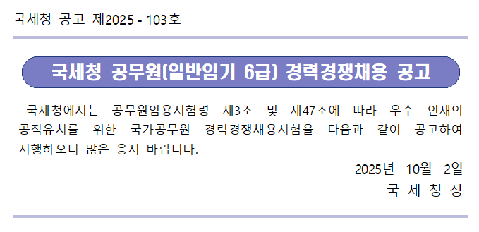국세청 공무원(일반임기 6급, 납보실장) 경력경쟁채용시험 재공고
