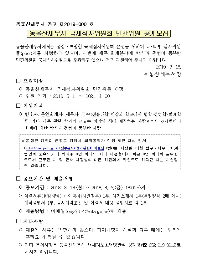 동울산세무서 국세심사위원회 민간위원 공개모집