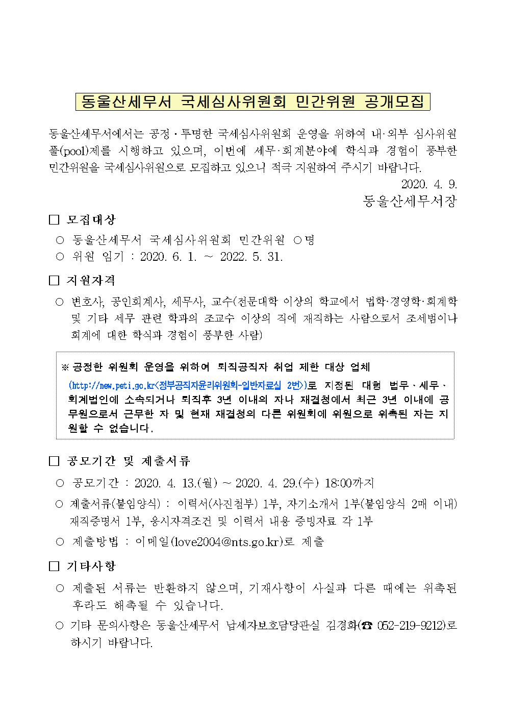 동울산세무서 국세심사위원회 민간위원 공개모집