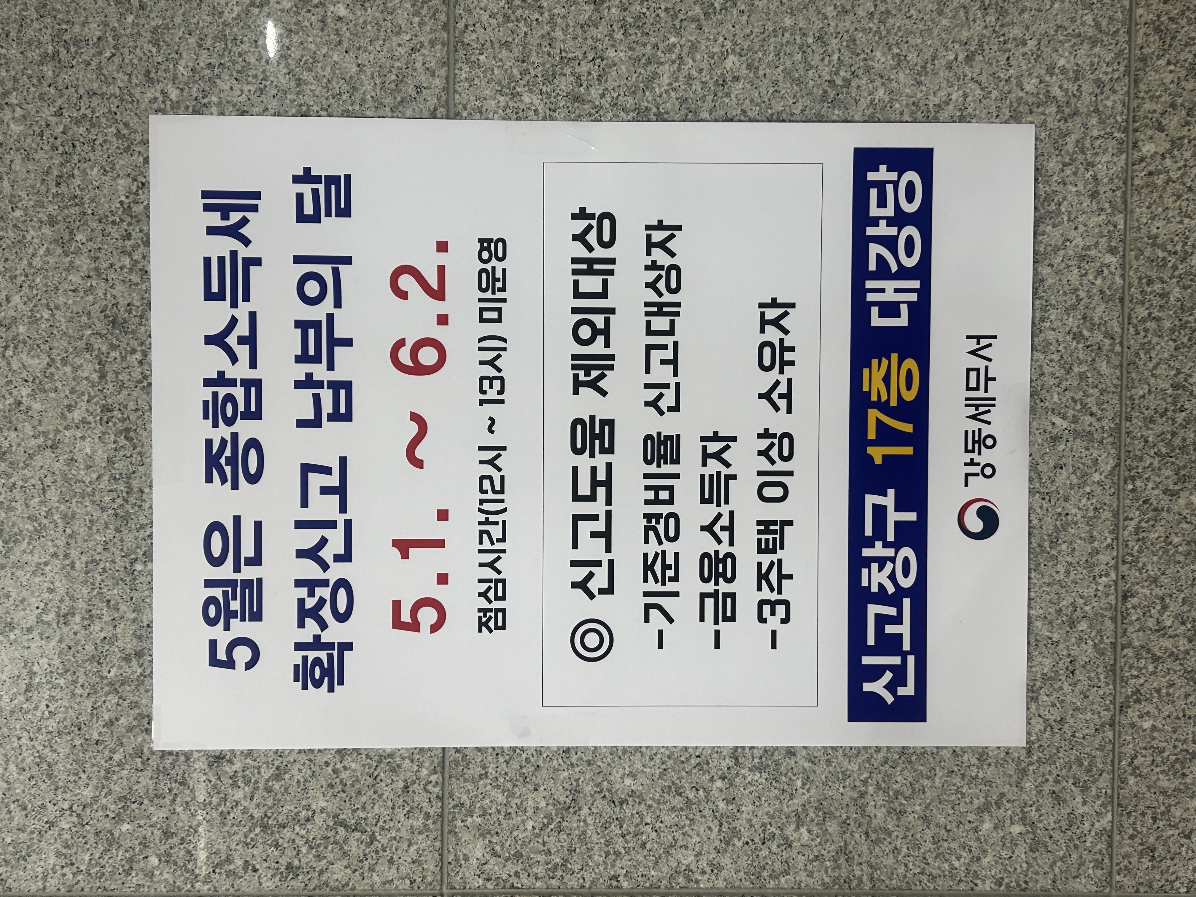 강동세무서(서장 임상진)는 원활한 종합소득세 신고를 지원하고자 강동세무서 17층 종합소득세 신고창구를 개설하였습니다.