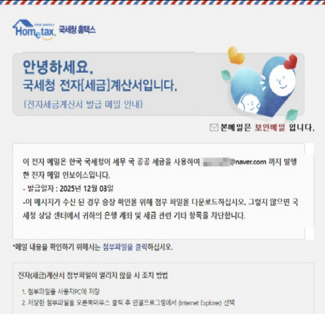 최근 국세청을 사칭하여 ‘전자세금계산서 발급 메일 안내’라는 제목의 메일이 발송되어 첨부파일 다운로드를 유도하는 사례가 발생하고 있으니, 개인정보 유출 등 피해 방지를 위해 첨부파일을 절대 다운로드하지 말고 삭제하시기 바랍니다.