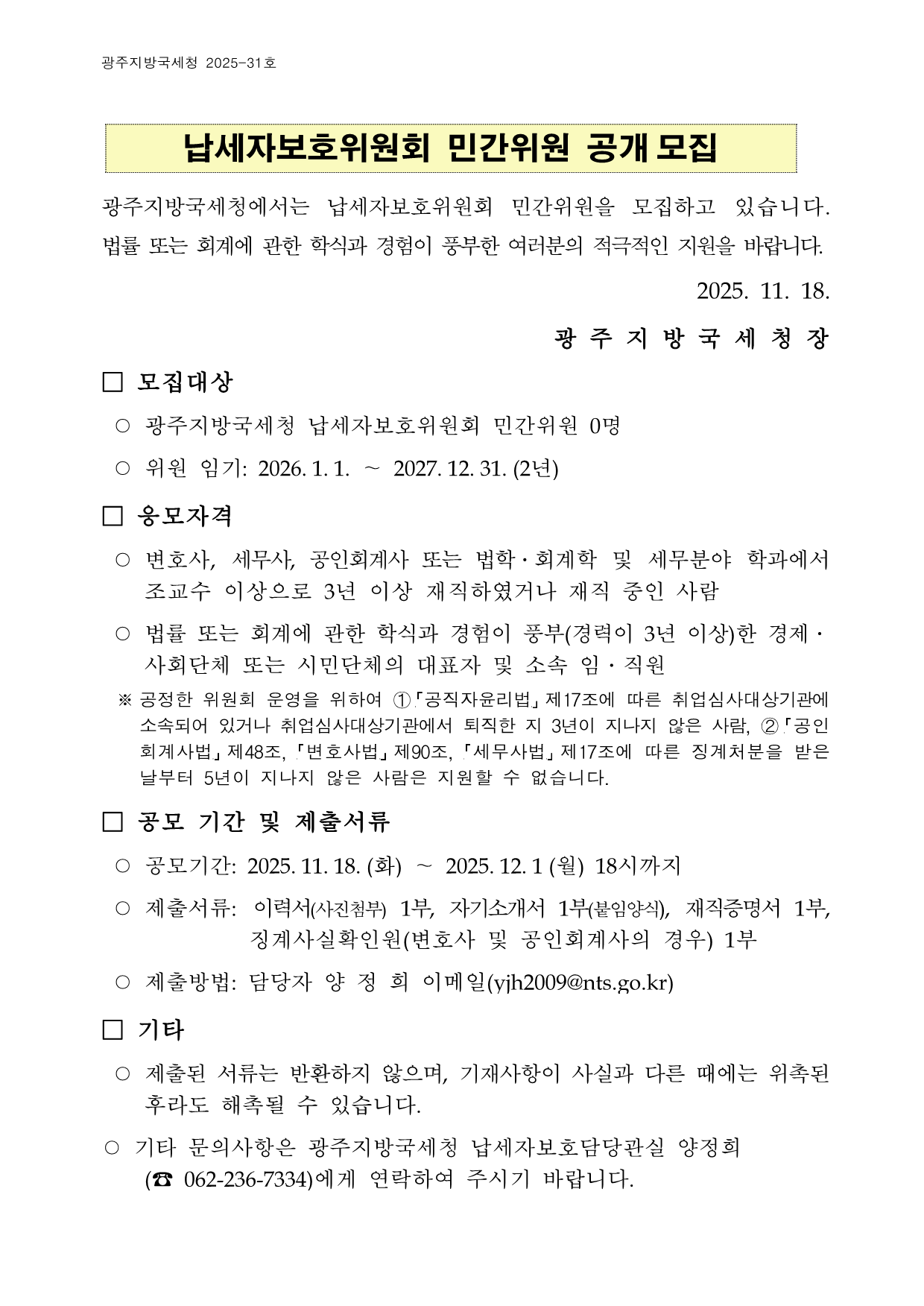 광주지방국세청 공무원(임기제) 경력경쟁채용시험 공고