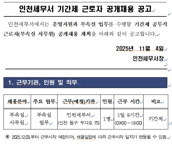 2025년 인천세무서 기간제 근로자(비서) 공개채용 공고.hwp