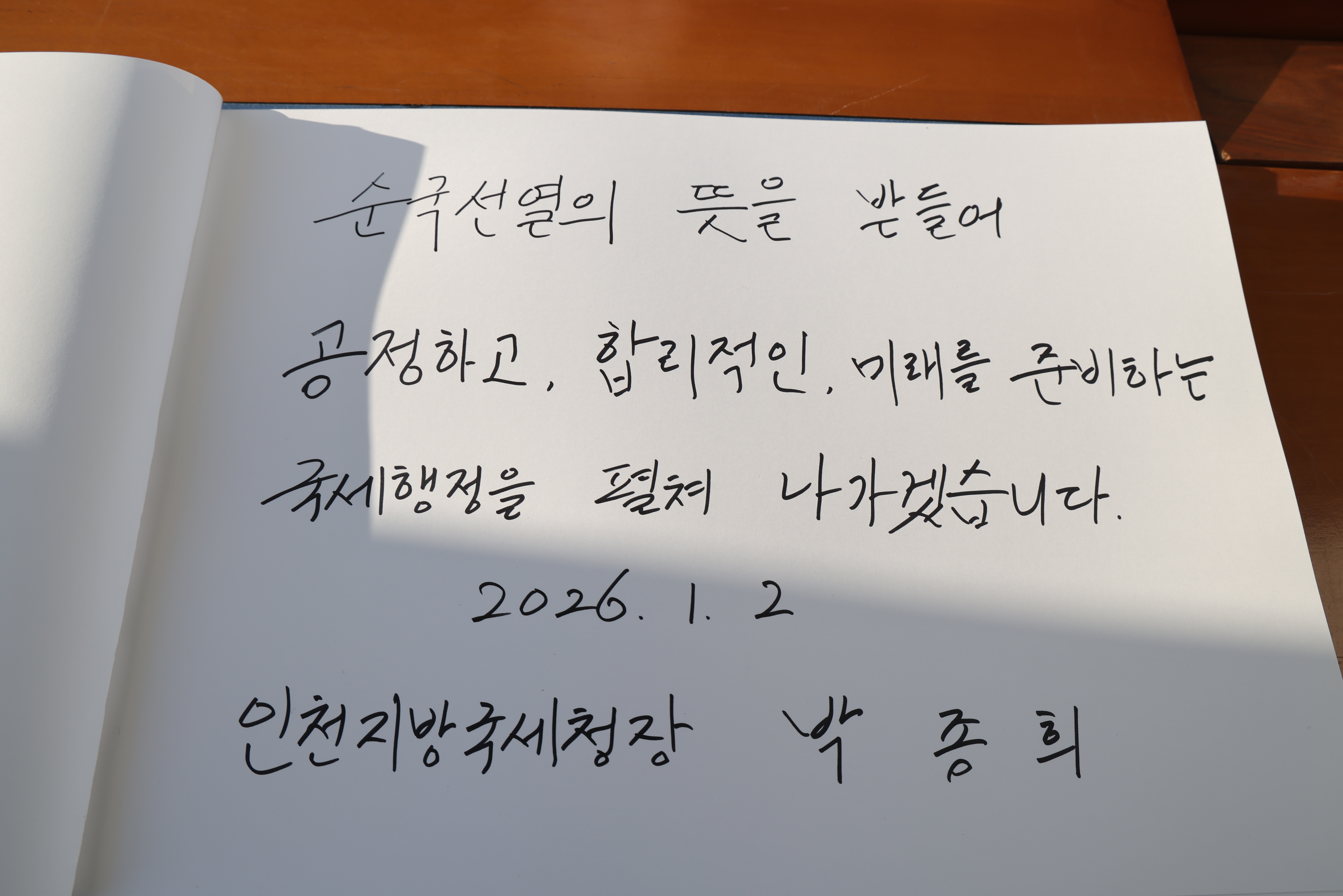 박종희 청장은 방명록에 '순국선열의 뜻을 받들어 공정하고, 합리적인, 미래를 준비하는 국세행정을 펼쳐 나가겠습니다.'라고