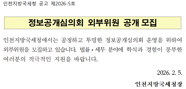 인천지방국세청 공고 2026-5호 정보공개심의회 외부위원 공개모집 인천지방국세청에서는 공정하고 투명한 정보공개심의회 운영을 위하여 외부위원을 모집하고 있습니다. 법률⋅세무 분야에 학식과 경험이 풍부한 여러분의 적극적인 지원을 바랍니다. 2026.2.5. 인천지방국세청장