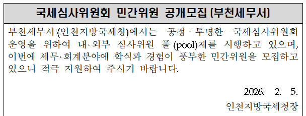 국세심사위원회 민간위원 공개모집(부천세무서) 부천세무서(인천지방국세청)에서는 공정ㆍ투명한 국세심사위원회 운영을 위하여 내‧외부 심사위원 풀(pool)제를 시행하고 있으며, 이번에 세무‧회계분야에 학식과 경험이 풍부한 민간위원을 모집하고 있으니 적극 지원하여 주시기 바랍니다. 2026. 2. 5. 인천지방국세청장