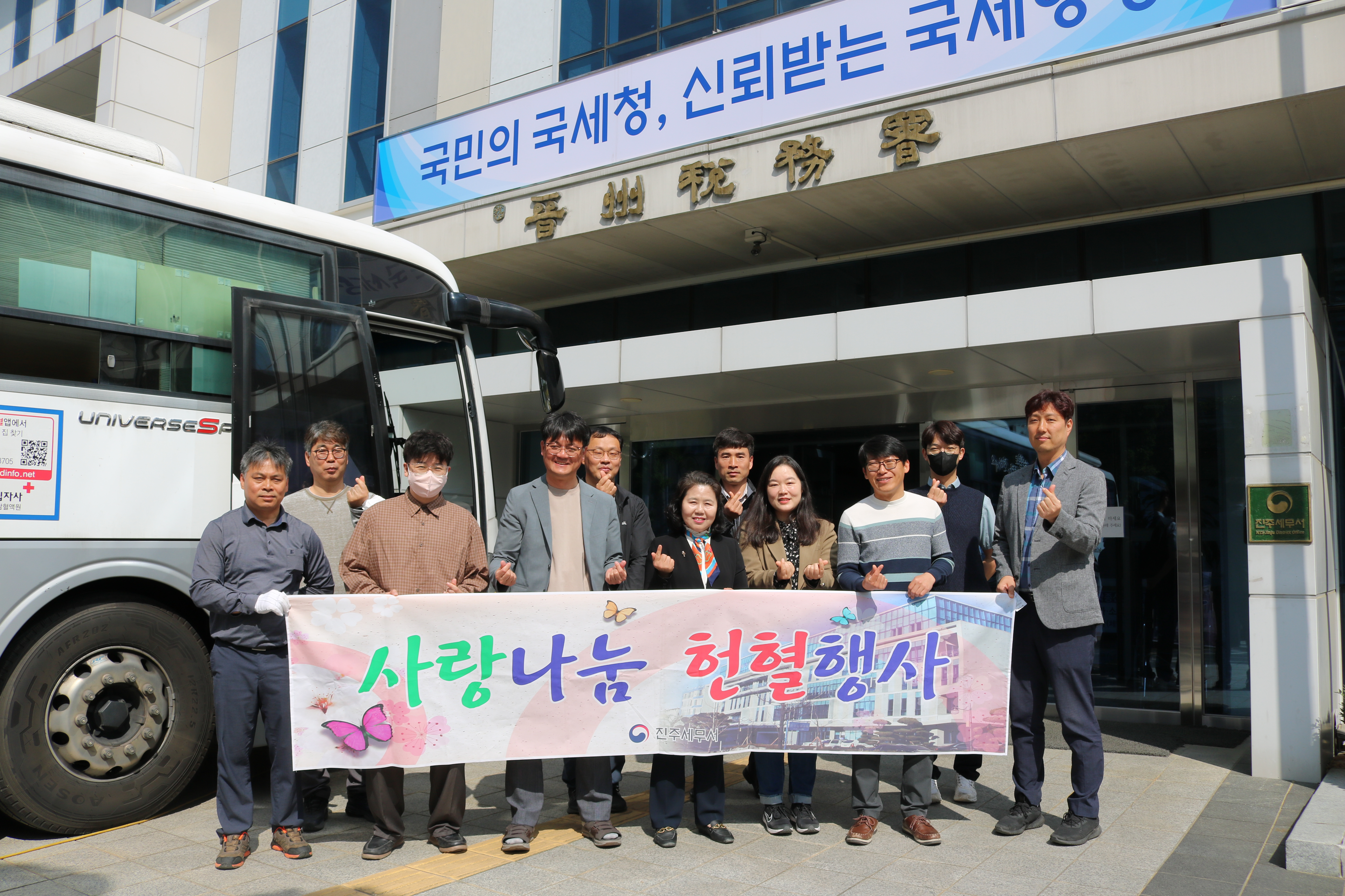 진주세무서(서장 김선미)는 2023. 4. 28.(금) 혈액부족으로 인한 국내 적정 혈액 보유량 유지가 어려운 상황에서 관리자를 비롯한 20여명의 직원이 헌혈에 적극 참여하여 건전하고 뜻있는 '생명 나눔 헌혈 문화 조성'에 동참하였습니다.