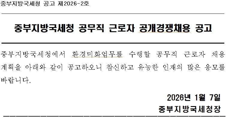 중부지방국세청 공고 제2026-2호 중부지방국세청 공무직 근로자 공개경쟁채용 공고 중부지방국세청에서 환경미화업무를 수행할 공무직 근로자 채용 계획을 아래와 같이 공고하오니 참신하고 유능한 인재의 많은 응모를 바랍니다. 2026년 1월 7일 중부지방국세청장