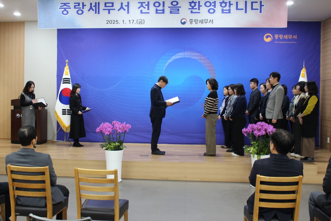 중랑세무서(서장 이철)는 지난 2025. 1. 17. (금) 5층 대강당에서 중랑세무서 전입 직원과 중랑세무서 내 과 이동 직원에게 인사발령 통지서를 수여하는 전입식을 진행하였습니다.
