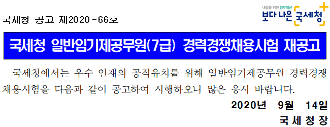 국세청 공고 제2020-66호 국세청 일반임기제공무원(7급) 경력경쟁채용시험 재공고 국세청에서는 우수 인재의 공직유치를 위해 일반임기제공무원 경력경쟁채용시험을 다음과 같이 공고하여 시행하오니 많은 응시 바랍니다. 2020년 9월 14일 국 세 청 장