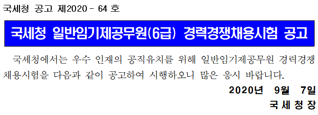 국세청 공고 제2020-64호 국세청 일반임기제공무원(6급) 경력경쟁채용시험 공고 국세청에서는 우수 인재의 공직유치를 위해 일반임기제공무원 경력경쟁채용시험을 다음과 같이 공고하여 시행하오니 많은 응시 바랍니다. 2020년 9월 7일 국 세 청 장