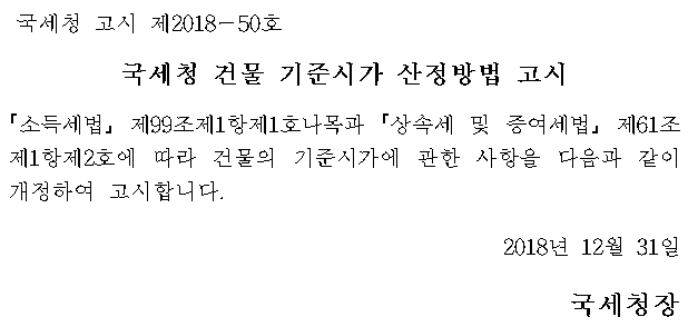 국세청 건물 기준시가 산정방법 고시 '소득세법' 제99조제1항제1호나목과 '상속세 및 증여세법' 제61조제1항제2호에 따라 건물의 기준시가에 관한 사항을 다음과 같이 개정하여 고시합니다. 2018년 12월 31일 국세청장