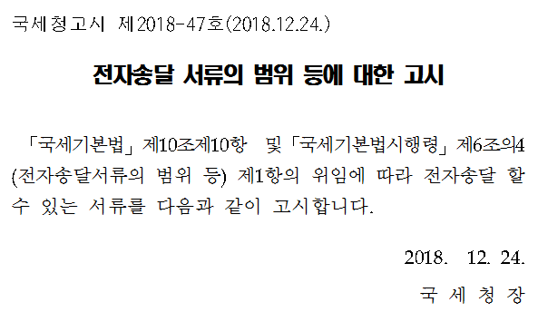 국세청고시 제2018-47호(2018.12.24.) 전자송달 서류의 범위 등에 대한 고시 「국세기본법」제10조제10항 및「국세기본법시행령」제6조의4(전자송달서류의 범위 등) 제1항의 위임에 따라 전자송달 할 수 있는 서류를 다음과 같이 고시합니다. 2018. 12. 24. 국 세 청 장