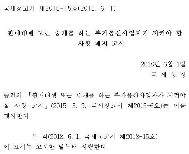 국세청고시 제2018-15호(2018. 6. 1) 판매대행 또는 중개를 하는 부가통신사업자가 지켜야 할 사항 폐지 고시 2018년 6월 1일 국 세 청 장 종전의 「판매대행 또는 중개를 하는 부가통신사업자가 지켜야 할 사항 고시」(2015. 3. 9. 국세청고시 제2015-6호)는 이를 폐지한다. 부 칙(2018. 6. 1. 국세청고시 제2018-15호) 이 고시는 고시한 날부터 시행한다.