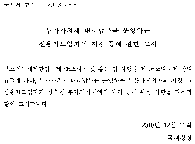 국세청 고시 제2018-46호 부가가치세 대리납부를 운영하는 신용카드업자의 지정 등에 관한 고시 「조세특례제한법」제106조의10 및 같은 법 시행령 제106조의14제1항의 규정에 따라, 부가가치세 대리납부를 운영하는 신용카드업자의 지정, 그 신용카드업자가 징수한 부가가치세액의 관리 등에 관한 사항을 다음과 같이 고시합니다. 2018년 12월 11일 국세청장