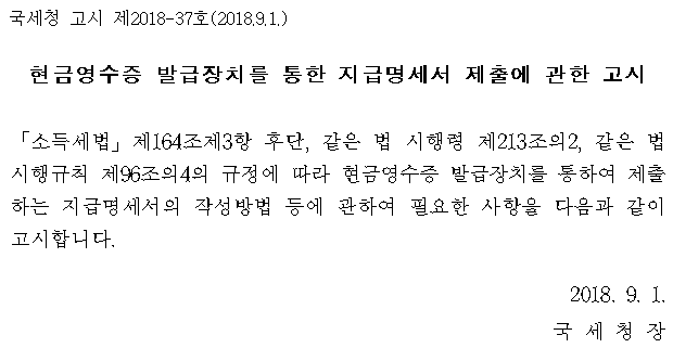 국세청 고시 제2018-37호(2018.9.1.) 현금영수증 발급장치를 통한 지급명세서 제출에 관한 고시 「소득세법」제164조제3항 후단, 같은 법 시행령 제213조의2, 같은 법시행규칙 제96조의4의 규정에 따라 현금영수증 발급장치를 통하여 제출하는 지급명세서의 작성방법 등에 관하여 필요한 사항을 다음과 같이 고시합니다. 2018. 9. 1. 국 세 청 장