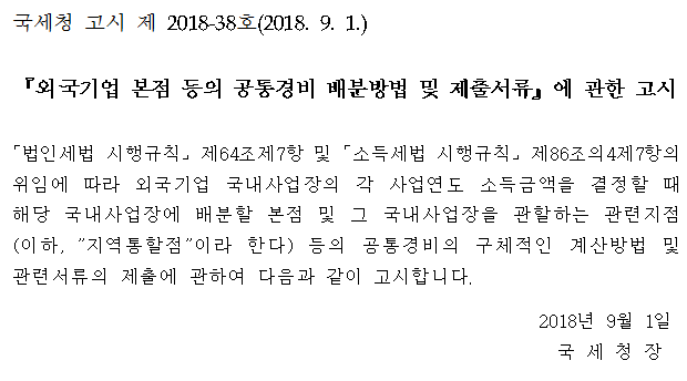 『외국기업 본점 등의 공통경비 배분방법 및 제출서류』에 관한 고시