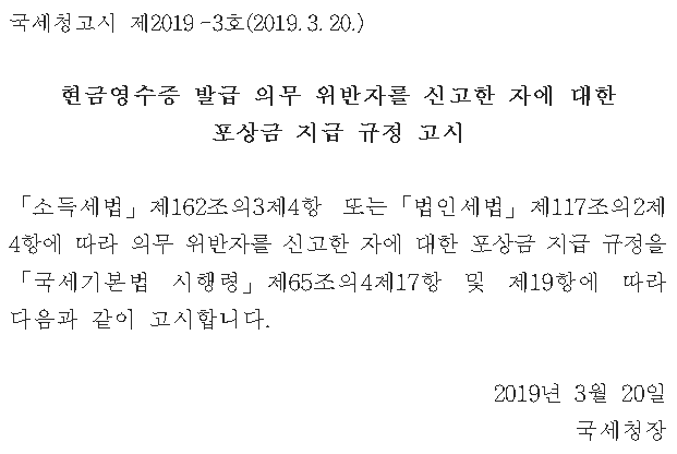 국세청고시 제2019-3호(2019.3.20.) 현금영수증 발급 의무 위반자를 신고한 자에 대한 포상금 지급 규정 고시 「소득세법」제162조의3제4항 또는「법인세법」제117조의2제4항에 따라 의무 위반자를 신고한 자에 대한 포상금 지급 규정을 「국세기본법 시행령」제65조의4제17항 및 제19항에 따라 다음과 같이 고시합니다. 2019년 3월 20일 국세청장