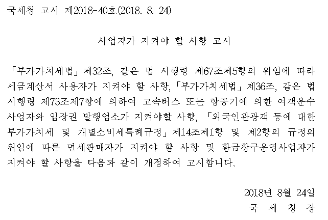 「부가가치세법」제32조, 같은 법 시행령 제67조제5항의 위임에 따라 세금계산서 사용자가 지켜야 할 사항,「부가가치세법」제36조, 같은 법 시행령 제73조제7항에 의하여 고속버스 또는 항공기에 의한 여객운수사업자와 입장권 발행업소가 지켜야할 사항, 「외국인관광객 등에 대한 부가가치세 및 개별소비세특례규정」제14조제1항 및 제2항의 규정의 위임에 따른 면세판매자가 지켜야 할 사항 및 환급창구운영사업자가 지켜야 할 사항을 다음과 같이 개정하여 고시합니다.