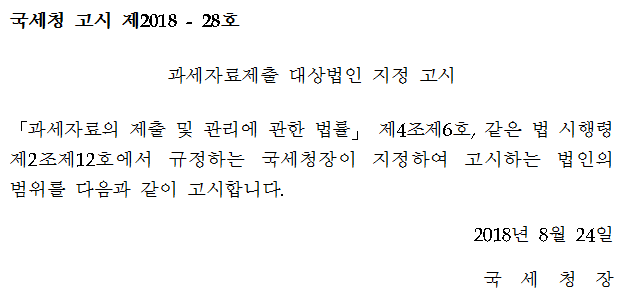 국세청 고시 제2018 - 28호 과세자료제출 대상법인 지정 고시 「과세자료의 제출 및 관리에 관한 법률」 제4조제6호, 같은 법 시행령 제2조제12호에서 규정하는 국세청장이 지정하여 고시하는 법인의 범위를 다음과 같이 고시합니다. 2018년 8월 24일 국 세 청 장