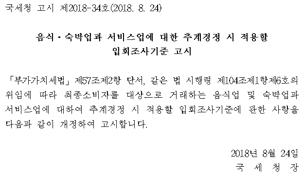 「부가가치세법」제57조제2항 단서, 같은 법 시행령 제104조제1항제6호의 위임에 따라 최종소비자를 대상으로 거래하는 음식업 및 숙박업과 서비스업에 대하여 추계경정 시 적용할 입회조사기준에 관한 사항을 다음과 같이 개정하여 고시합니다.