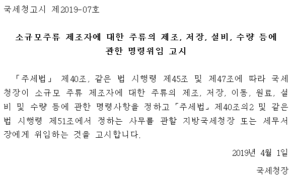 「주세법」 제40조, 같은 법 시행령 제45조 및 제47조에 따라 국세청장이 소규모 주류 제조자에 대한 주류의 제조, 저장, 이동, 원료, 설비 및 수량 등에 관한 명령사항을 정하고 ?주세법? 제40조의2 및 같은 법 시행령 제51조에서 정하는 사무를 관할 지방국세청장 또는 세무서장에게 위임하는 것을 고시합니다.