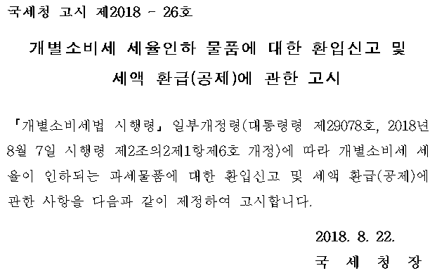 국세청 고시 제2018 - 26호 개별소비세 세율인하 물품에 대한 환입신고 및 세액 환급(공제)에 관한 고시 ?개별소비세법 시행령? 일부개정령(대통령령 제29078호, 2018년 8월 7일 시행령 제2조의2제1항제6호 개정)에 따라 개별소비세 세율이 인하되는 과세물품에 대한 환입신고 및 세액 환급(공제)에 관한 사항을 다음과 같이 제정하여 고시합니다. 2018. 8. 22. 국 세 청 장
