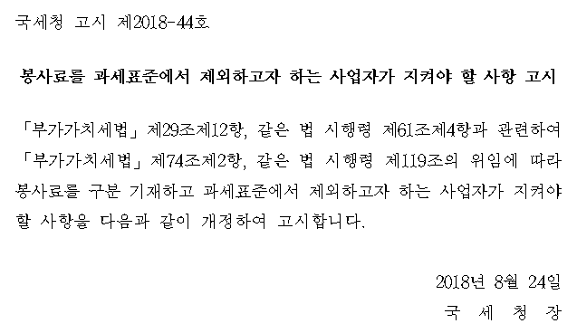 국세청 고시 제2018-44호 봉사료를 과세표준에서 제외하고자 하는 사업자가 지켜야 할 사항 고시 「부가가치세법」제29조제12항, 같은 법 시행령 제61조제4항과 관련하여「부가가치세법」제74조제2항, 같은 법 시행령 제119조의 위임에 따라 봉사료를 구분 기재하고 과세표준에서 제외하고자 하는 사업자가 지켜야 할 사항을 다음과 같이 개정하여 고시합니다. 2018년 8월 24일 국 세 청 장