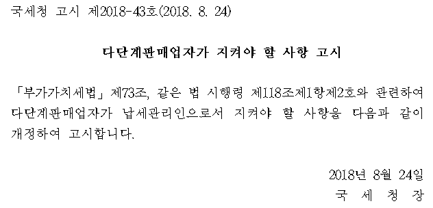 국세청 고시 제2018-43호(2018. 8. 24) 다단계판매업자가 지켜야 할 사항 고시 「부가가치세법」제73조, 같은 법 시행령 제118조제1항제2호와 관련하여 다단계판매업자가 납세관리인으로서 지켜야 할 사항을 다음과 같이 개정하여 고시합니다. 2018년 8월 24일 국 세 청 장