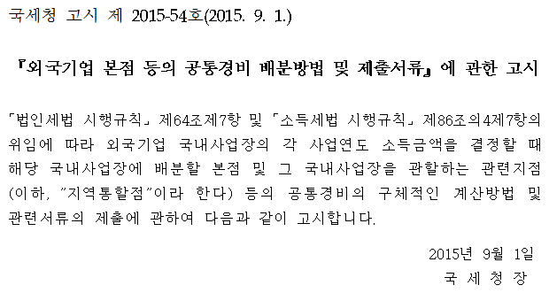 『외국기업 본점 등의 공통경비 배분방법 및 제출서류』에 관한 고시