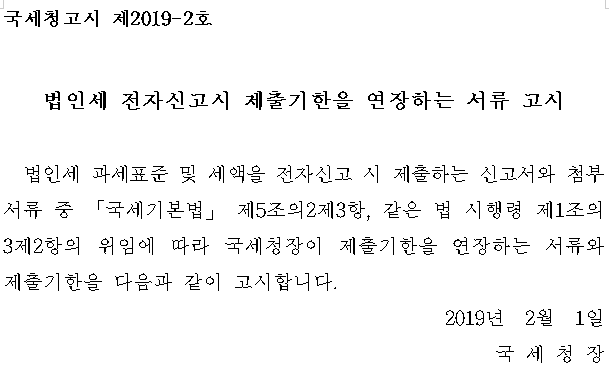 국세청고시제2019-2호「법인세전자신고시제출기한을연장하는서류고시」.hwp