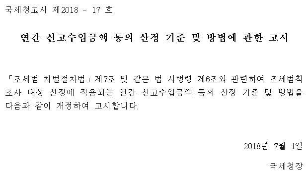 국세청고시 제2018 - 17 호 연간 신고수입금액 등의 산정 기준 및 방법에 관한 고시 「조세범 처벌절차법」제7조 및 같은 법 시행령 제6조와 관련하여 조세범칙조사 대상 선정에 적용되는 연간 신고수입금액 등의 산정 기준 및 방법을 다음과 같이 개정하여 고시합니다. 2018년 7월 1일 국세청장