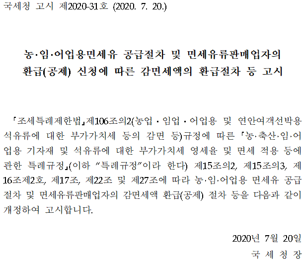「조세특례제한법」제106조의2(농업ㆍ임업ㆍ어업용 및 연안여객선박용 석유류에 대한 부가가치세 등의 감면 등)규정에 따른 「농·축산·임·어업용 기자재 및 석유류에 대한 부가가치세 영세율 및 면세 적용 등에 관한 특례규정」(이하 “특례규정”이라 한다) 제15조의2, 제15조의3, 제16조제2호, 제17조, 제22조 및 제27조에 따라 농·임·어업용 면세유 공급절차 및 면세유류판매업자의 감면세액 환급(공제) 절차 등을 다음과 같이 개정하여 고시합니다.