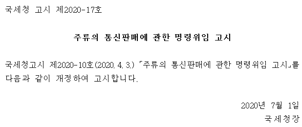 국세청 고시 제2020-17호 주류의 통신판매에 관한 명령위임 고시 국세청고시 제2020-10호(2020.4.3.) 「주류의 통신판매에 관한 명령위임 고시」를 다음과 같이 개정하여 고시합니다. 2020년 7월 1일 국세청장