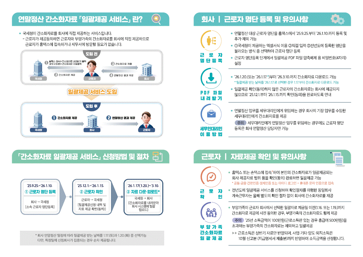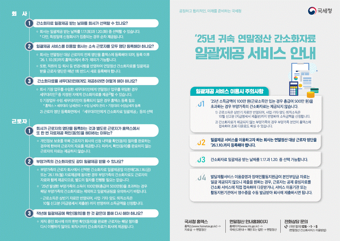 국세청은 근로자가 직접 홈택스에서 내려받아 회사에 제출하던 연말정산 간소화자료를 국세청이 회사에 직접 제공하는 「일괄제공 서비스」를 시행하고 있습니다. 「일괄제공 서비스」는 근로자의 동의(확인) 절차만 거치면 간소화자료를 국세청이 직접 회사에 제공하므로, 근로자가 홈택스에 접속하거나 세무서에 방문할 필요가 없으며 회사 담당자도 취합에 어려움을 덜 수 있습니다. 회사 측에서는 소속 근로자들의 원활한 자료제공 동의(확인)가 이뤄질 수 있도록 '25. 11월까지 근로자 명단을 조기에 등록하여 주시기 바랍니다.