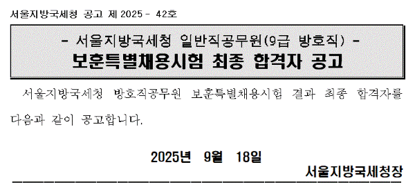 서울지방국세청 공고 제2025-42호 입니다. 서울지방국세청 방호직공무원 보훈특별채용시험 결과 최종 합격자를 다음과 같이 공고합니다. 2025년 9월 18일 서울지방국세청장