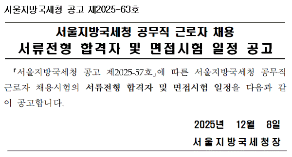 서울지방국세청 공고 제2025-63호 입니다. 서울지방국세청 공고 제2025-57호에 따른 서울지방국세청 공무직 근로자 채용시험의 서류전형 합격자 및 면접시험 일정을 다음과 같이 공고합니다. 2025년 12월 8일 서울지방국세청장